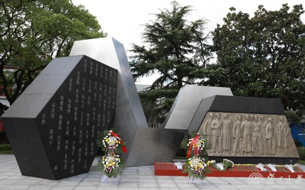 焦扬、许宁生等校领导缓步来到纪念雕像前,驻足凝视,代表全校师生整理花篮缎带。理毕,退后三步,带领在场全体师生向烈士雕塑行三鞠躬礼。随后,在焦扬、许宁生的带领下,烈士家属代表、老师、同学整齐列队缓步上前敬献鲜花。