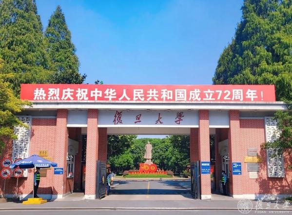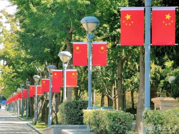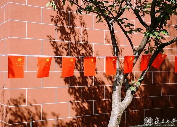 满园红裳,复旦庆祝中华人民共和国72华诞。道路旁,旗杆顶,路灯下,五星红旗布满学校的各个角落。悬起灯笼,摆上立牌,食堂内外,到处洋溢欢度国庆的气息。