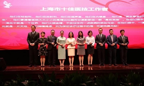 “上海市十佳医技工作者”颁奖现场(左二为张弢副研究员,左五为李智平医生)
