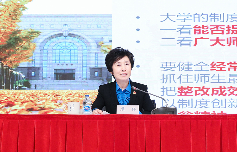 焦扬根据中央宣讲提纲,结合李强书记在上海市的宣讲内容和教育战线实际,带领师生深入学习了《决定》的结构和内容。她强调,全校要始终坚持正确办学方向、践行“四个服务”,为巩固和发展中国特色社会主义制度作出应有贡献。要在学深悟透四中全会精神的基础上,结合学校实际,大力推进制度创新和治理能力建设,把中国特色社会主义大学制度优势更好地转化为制度建设成果和治理水平效能。一要转化为加强党的全面领导的坚定执行力。结合主题教育整改落实,扎实推进8项专项整治任务和33项整改项目,把党的全面领导进一步内嵌到办学治校的制度体系之中。二要转化为落实立德树人根本任务的自觉行动力。深入推进“三全育人”综合改革,形成长效化、一体化的立德树人落实机制。三要转化为全面深化改革的根本推动力。根据学校第十五次党代会部署,全面深化改革,更多针对深层次的体制机制问题,注重系统性、整体性、协同性,加快推进中国特色现代大学治理体系和治理能力现代化。四要转化为加快“双一流”建设的核心竞争力。对标四中全会要求,把构建中国特色世界一流大学治理体系、提高现代大学治理能力作为学校“双一流”建设的重要内容,作为“十四五”期间的核心任务。五要转化为办好人民满意教育的重要保障力。健全经常性倾听基层声音的制度,抓住师生最关心最直接最现实的问题,全面提升学校管理效能,以制度创新激发每一位师生员工的主人翁精神,让师生有更多获得感、幸福感、参与感、认同感。