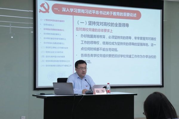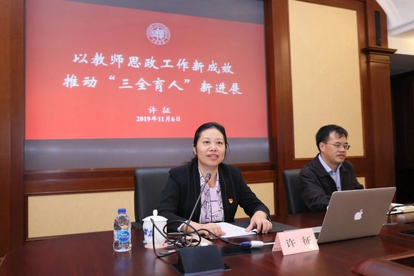 她表示,做好教师思想政治工作,首要就是要做好教师党员的思想政治工作,通过重点半数带动最大多数;就是要以筑牢教师精神之基,引导教师增强“四个意识”,坚定“四个自信”,弘扬爱国奋斗精神,在新时代建功立业,为党育人,为国育才;就是要充分发挥全体教师的积极性、主动性、创造性,提高教师的育人意识和育人能力,推动更多教师在“三全育人”中有行动、有响动。在分析了教师思政工作定位、进展及现存问题的基础上,许征对进一步做好教师思政工作提出树立导向、结合实际、抓住重点、以人为本、善思善为五方面要求。