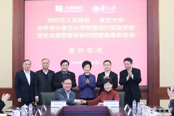 签约仪式由复旦大学党委副书记、上海医学院党委书记袁正宏主持。会上,复旦大学常务副校长、上海医学院院长桂永浩,副校长张人禾分别与闵行区副区长杨德妹签署《深化医教研协同型健康服务体系共同建设协议》《合作举办复旦大学附属闵行实验学校协议》。闵行区委副书记、组织部部长王观宝,复旦大学副校长张人禾,复旦大学上海医学院副院长汪志明,以及区校相关职能部门负责同志参加签约活动。