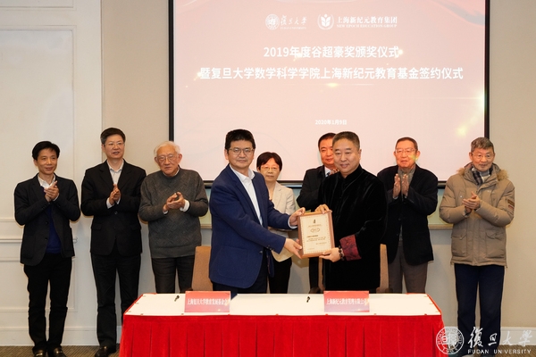 1月9日下午,2019年度谷超豪奖颁奖仪式暨“复旦大学数学科学学院上海新纪元教育基金”签约仪式在光华楼东辅楼101室举行。全国政协常委、民革中央副主席、上海市人大常委会副主任、民革上海市委主委高小玫,民革中央委员、民革上海市委会副主委、全国政协委员、上海市政协常委王光贤,复旦大学常务副校长、中国科学院院士金力,中国科学院院士李大潜、洪家兴、陈恕行,上海新纪元教育集团董事长陈伟志,浙江省人民政府驻上海办事处副主任章春华,温州市政府驻上海联络处徐珅隆,历届“谷超豪奖”获奖者,复旦大学对外联络与发展处负责同志,数学科学学院党政领导班子成员、教师及学生代表出席参加活动。