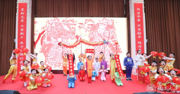 团拜会上,一个个精彩的文艺节目把气氛带向高潮。复旦二附校20多位可爱的孩子带来集体舞《元日》,欢快的舞蹈表达了孩子们对迈入新时代、走进新校园的无比喜悦;数学科学学院教授林伟、物理学系教授吴施伟、化学系教授李巧伟、先进材料实验室副研究员彭瑞等四位青年科学家带来诗朗诵《未来请看我》,表达复旦人用一腔赤子之心报效祖国,立足岗位建功立业的豪情;复旦的血脉,传承着红色的基因,复旦的师生,弘扬着优秀传统文化,档案馆退休教师高晓虹带来京剧《红灯记》选段《都有一颗红亮的心》,计算机科学技术学院辅导员王秦带来京剧《打龙袍》选段《见皇儿跪埃尘》;万水千山不忘来时路,斗转星移牢记肩上担,工会合唱团带来压轴歌曲《不忘初心》,团拜会在全场合唱《复旦大学校歌》中结束。