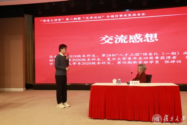 现场聆听了黄宝妹的事迹后,历史学系2018级本科生、刚刚通过第28批“人才工程”预备队(一期)选拔的郭怡冰,材料科学系2020级本科生、复旦大学青年五四奖章获得者苏比•艾合买提以及中国语言文学系2020级本科生、第四期新骨班学员张婷怡3位本科生代表带着自己的故事和经历,向黄宝妹当面交流汇报学习心得与自己的经历体会。