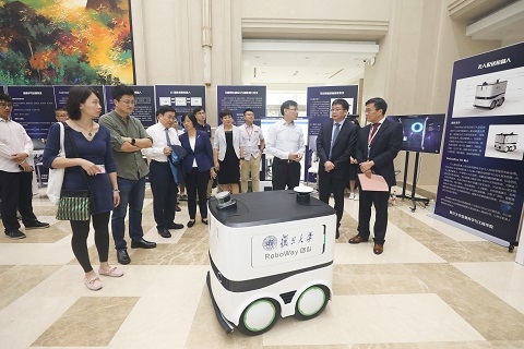 主题论坛期间,学校在光华楼二楼志和堂设置互动展示区,展示健康顾问机器人amika、中医机器人、自动驾驶物流配送机器人、便携式警用人车智能识别设备与系统、“不倒翁”知识问答系统等复旦大学在人工智能领域的最新科研进展与成果。