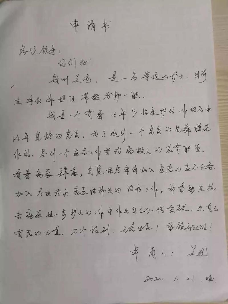 吴艳的一封手写申请书更是令很多人动容,“我是一名有着13多年临床护理工作经验和14年党龄的党员,看着病毒肆虐,自愿报名申请加入医院的应急任务……不计报酬、无论生死,望领导批准!”