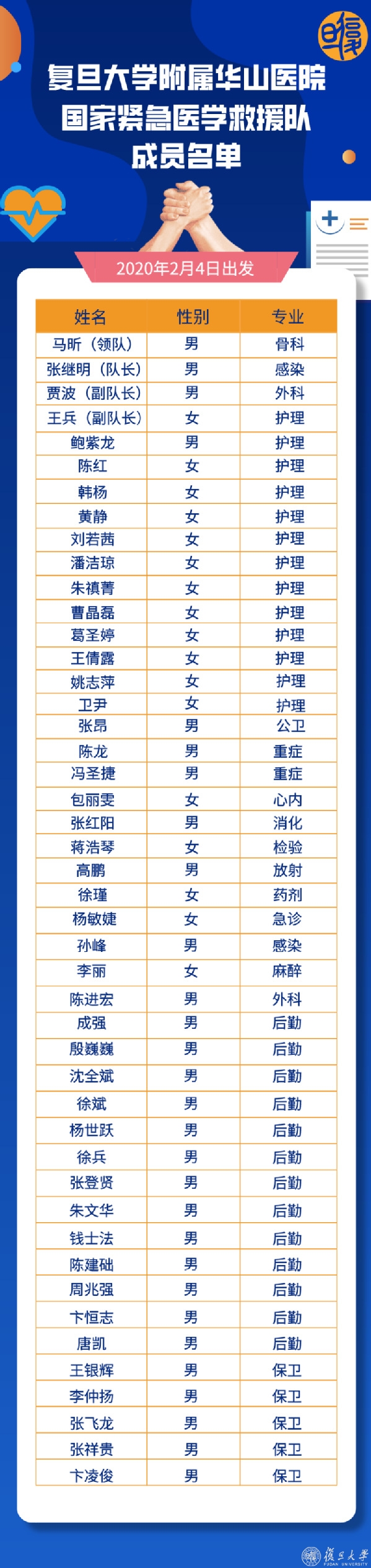 2月2日晚上8点,接国家卫生健康委指令,作为“国家队”的复旦大学附属华山医院国家紧急医学救援队全体队员进入随时待命状态。2月3日晚8点半,出征任务确定,1小时之内,救援队组队完毕!此次国家医学救援队由副院长马昕教授任领队、感染科副主任张继明教授任队长,医务处贾波和后勤保障部副主任王兵任副队长,队员包括临床医生、护士、医技、管理、后保等医院各部门骨干人员。与此同时,装载了大量药品、检验检疫设备、防护用品、生活用品、食品等的手术车、重症转运车、医技辅助车、生活车、水电车、物资运输车等6辆大型移动医疗救援车也同时出发前往武汉,这支救援队将以“整建制”“移动野战医院”的形式为提高武汉当地疫情防控医疗水平做出华山人的努力。