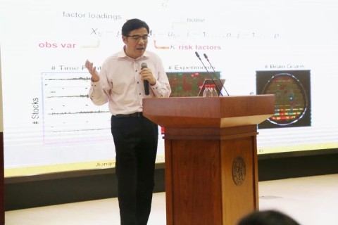 数学科学学院院长陈猛教授主持讲坛,并简要介绍了范剑青的研究领域和学术成果。范剑青是国际统计学会、国际数理统计学会、美国统计学会、美国科学促进会、计量金融学会等学术组织会士,主要研究领域为高维统计、机器学习、大数据科学、经济学、金融学、生物信息等,现任国际统计概率领域多家期刊主编、副主编。范剑青于2000年获得国际统计学领域最高奖项COPSS总统奖,2006年荣获洪堡基金会终身成就奖,2007年荣获晨兴华人数学家大会应用数学金奖,2013年获泛华统计学会许宝禄奖,2014年荣获英国皇家统计学会授予的“GuyMedal”银质奖章,2018年美国统计学NoetherAward。