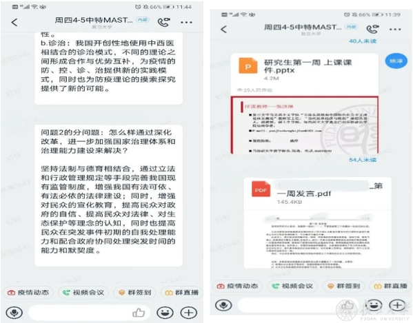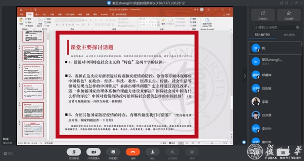 3月2日,复旦大学全面开启了研究生课程网上教学。除体育、实习实践实验及其他不适合网上教学的课程外,全校1310门研究生课程全部移至“云”端,1392名授课教师与8700多名研究生冲破时空的阻隔,相聚“云”端在线开展教学和学习活动。