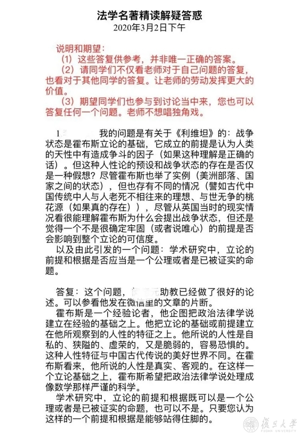 网络课程授课结束,授课教师仍不忘及时“解惑”,不少老师还对课堂研讨中的主题作出详细的回应。法学院侯健老师在《法学名著精读》课上,对同学们课堂讨论中的“谢谢”,极为明确地提示“不要客气话”。课程结束后,侯健提供了一份word版《法学名著精读解疑答惑》,对课堂讨论中的问题一一作出了书面回复。