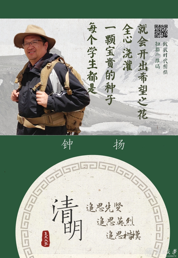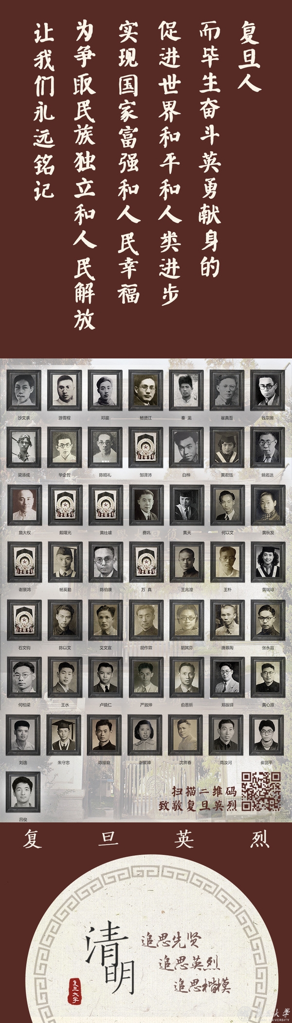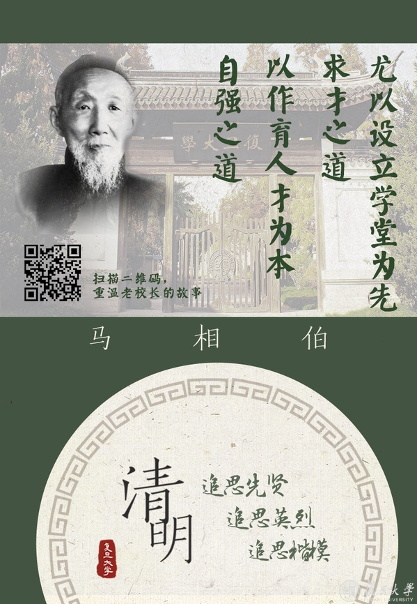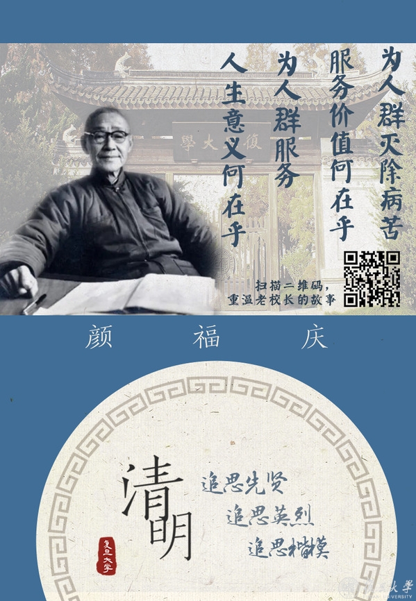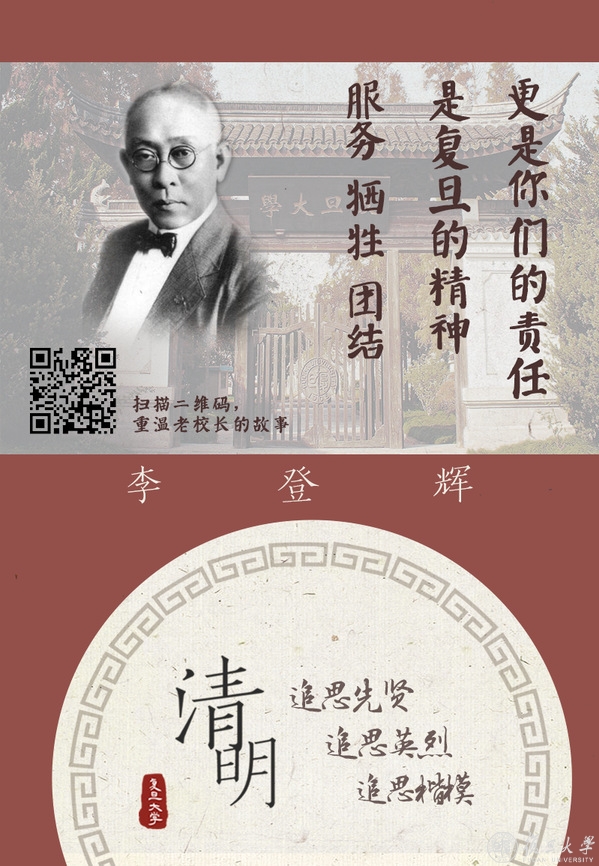 复旦大学主页推出“清明追思”系列主题海报,追思复旦先贤、英烈和楷模。身虽远去,精神长存,我们相信,他们的故事值得一代代讲下去。