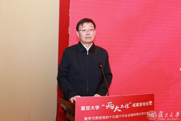 12月19日下午,“两大工程”一期成果20本著作在复旦大学“两大工程”成果发布仪式暨学习贯彻党的十九届六中全会精神理论研讨会上正式揭幕。上海市委常委、宣传部部长周慧琳,复旦大学党委书记焦扬,上海世纪出版集团党委书记、董事长黄强在“两大工程”成果发布会上致辞。复旦大学党委常务副书记裘新主持。
