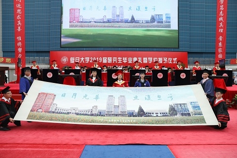 典礼上,2019届全体毕业研究生向母校送上毕业纪念品喷涂画卷《聚沙成塔》,寓意复旦学子将团结一心,凝聚共识,自强不息,奋力拼搏,以累累硕果助力母校“双一流”建设。焦扬代表学校接受毕业纪念品。