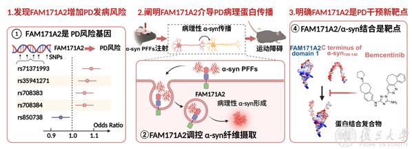 郁金泰团队结合临床数据和基础实验,发现了此前未知功能基因FAM171A2可作为这一关键受体。他们还精确鉴定了FAM171A2与病理性α-突触核蛋白相互作用的界面,并利用人工智能技术筛选到了能起到抑制作用的小分子。在体外和体内模型中,均可有效抑制毒性蛋白在神经元间的传播。这些发现表明,FAM171A2可能是首个阻断帕金森病进程的治疗靶点。