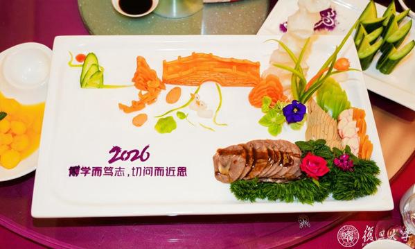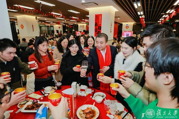 邯郸校区旦苑餐厅,张灯结彩、喜气洋洋。师生们围坐桌前,畅谈甚欢。