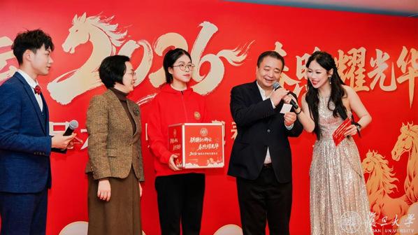上海市教育卫生工作委员会书记江帆、复旦大学校长金力抽取马年新春“开年奖”,并向中奖学生发放奖品。出席活动的还有副校长陈志敏、党委副书记钱海红、校长助理陈焱。