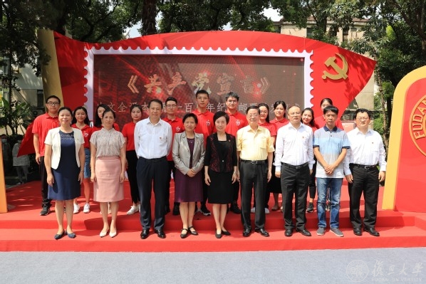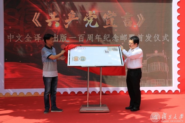 复旦大学党委副书记、副校长周亚明与著名邮票设计师、鲁迅美术学院教授、纪念邮票设计师李晨共同为《共产党宣言》中译本出版一百周年首日封揭幕。