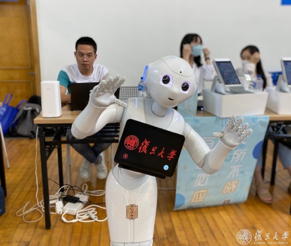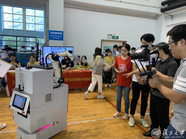 在今年“特殊”的迎新季,现场还有一台来自复旦大学工程与应用技术研究院智能工业机器人实验室的消毒机器人。它不仅可以实现大范围消毒,还可以实现对特定目标的定点、跟踪喷洒消毒及擦拭消毒。这款机器人不仅向新生们展示了人工智能的科研成果,还体现了科学研究与实际结合,适应社会需求的目标。