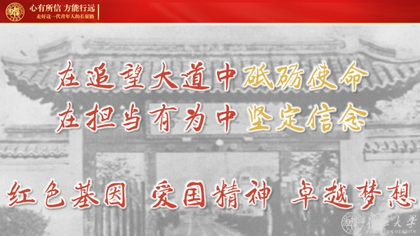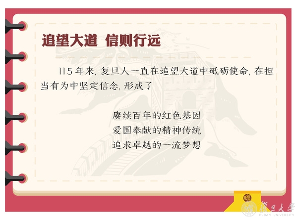 “追望大道,求索不息;信仰恒在,历久弥新。100年来,一代代复旦人在报国奋斗的征途上,坚持问道、明道、弘道,奠定了今日复旦之辉煌;一代代复旦青年在追求真理之路上,坚持笃志、笃学、笃行,传承红色基因、光大复旦精神。”