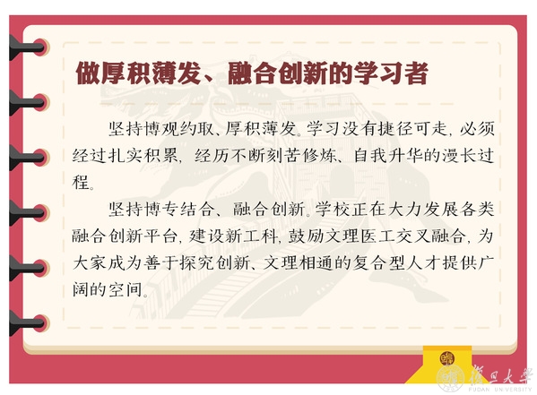 “复旦人应该以天下和人民福祉为己任,思考大问题、追寻大意义,同时又有务实的行动、朴实的生活,明白人生的绚烂来自坚忍不拔、锲而不舍的坚守。”