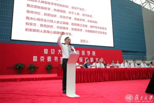 “健康所系,性命相托。当我步入神圣医学学府的时刻……”最后,在全体与会人员的共同见证下,复旦大学党委副书记、上海医学院党委书记袁正宏带领复旦大学上海医学院克卿书院2020级全体学生进行了神圣而庄严的医学生宣誓仪式。