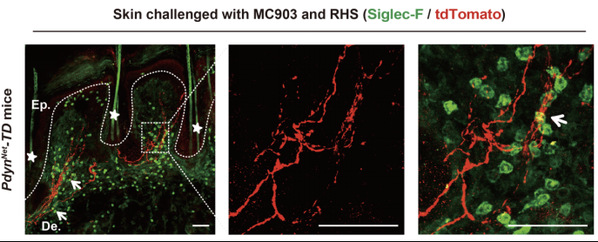 图2:RHS处理后,特应性皮炎小鼠皮肤中的Pdyn+交感神经纤维(tdTomato+,红色)与嗜酸性粒细胞(Siglec-F+,绿色)呈现紧密的空间毗邻关系。