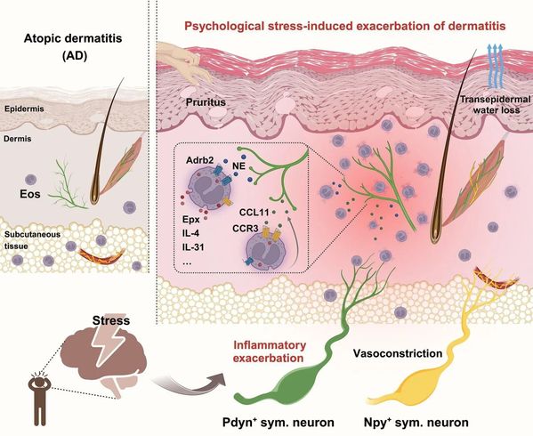 “研究系统阐明了一条由大脑心理压力应激信号驱动的‘交感神经—嗜酸性粒细胞’神经免疫轴。通过解析交感神经元亚型的功能分工,研究从神经解剖与分子机制层面回答了大脑应激信号如何精准调控皮肤免疫的关键问题。”柳申滨介绍说,“这些关键分子的发现也为特应性皮炎的临床干预提供了潜在靶点。”同时,这一最新研究成果也强调了心理状态作为重要临床变量的意义,为将心理干预纳入皮肤病综合管理提供了科学依据。
