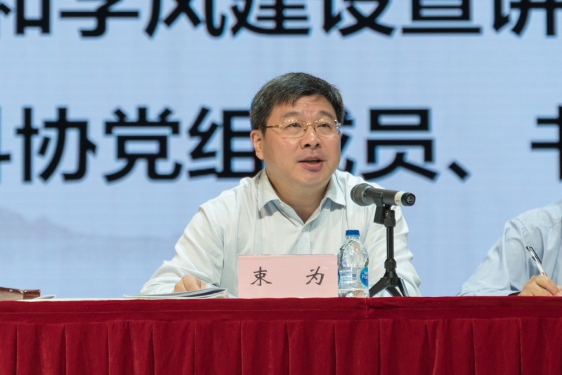 随后,中国科协党组成员、书记处书记束为同志发表讲话,他围绕习近平总书记对科技系统学风建设提出的九项指标向与会师生分享了三点建议:第一,深刻认识弘扬科学家精神的重要意义和丰富内涵,做科学家精神的践行者;第二,要坚守科研诚信体现,力戒作风、学风的浮躁;第三,强化师生传承,更好发挥导师在研究生科学道德和学风建设中的作用。