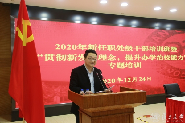 12月24日下午,党委党校2020年新任职处级干部培训班暨“贯彻新发展理念,提升办学治校能力”专题培训结业式在光华楼东辅楼102报告厅举行。复旦党委书记、党校校长焦扬以《学习贯彻党的十九届五中全会精神 筑牢政治能力之本 练就干事成事之才》为题,为培训班全体成员上专题党课,围绕当前形势怎么看、学校事业怎么干两个方面向学员提出期望和要求。